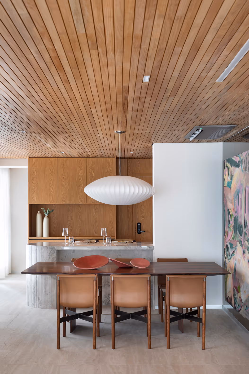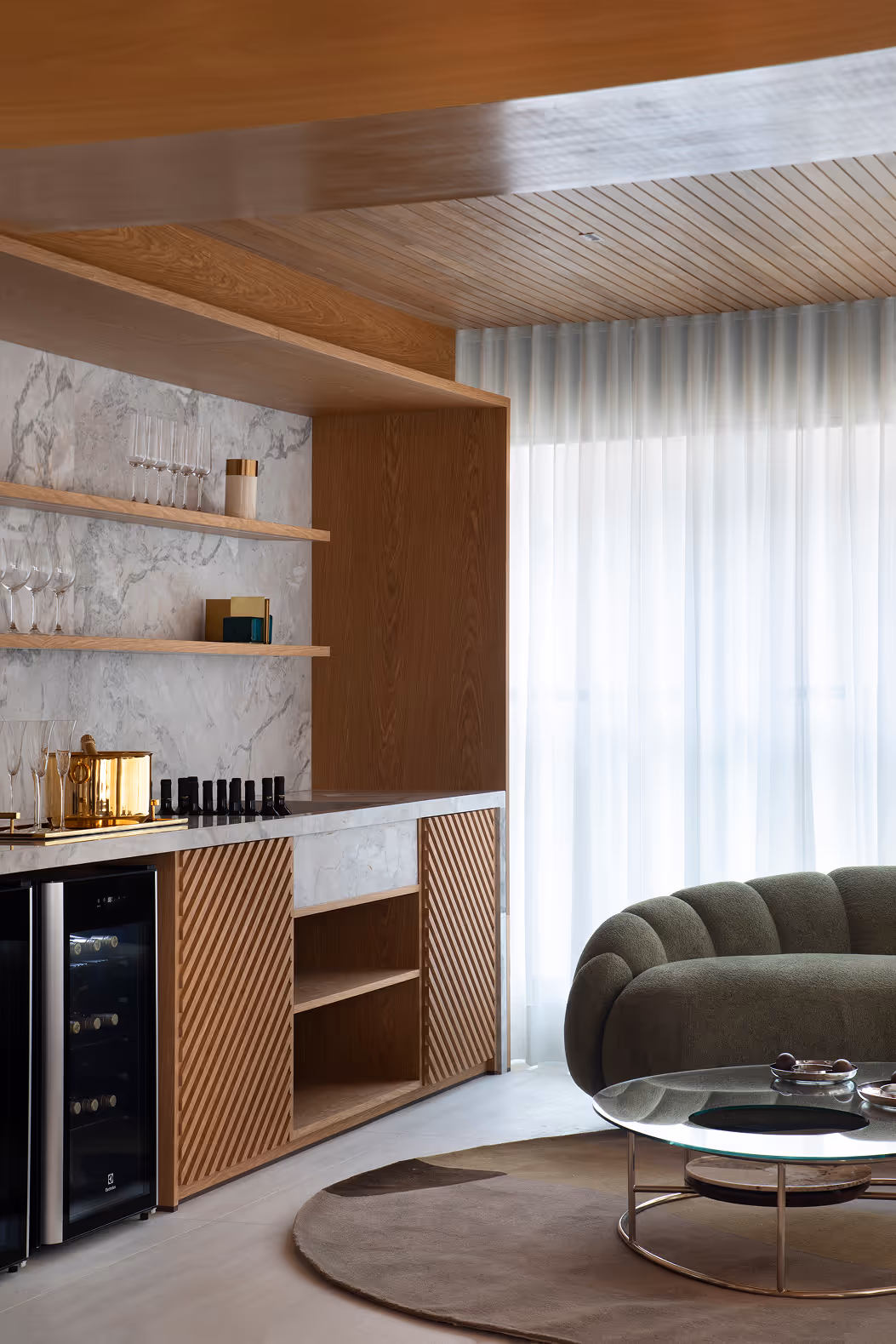 Um dos conceitos centrais do projeto é o feito sob medida. Painéis e portas em madeira natural foram desenhados pelo escritório, explorando a plasticidade dos materiais e enfatizando a curvatura dos pilares existentes. O teto revestido em madeira natural reforça a conexão com a natureza e amplia a sensação de acolhimento.