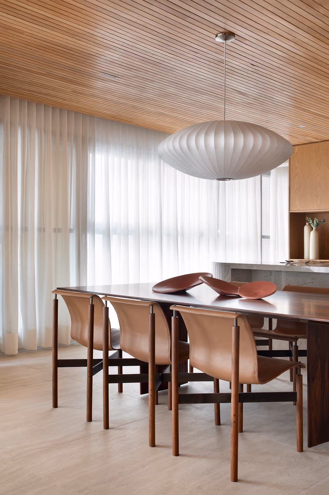 Outro desafio do projeto foi resolver uma planta longilínea e estreita. A estratégia adotada foi utilizar mobiliário que acompanha essa proporção, criando continuidade espacial. Um dos elementos articuladores é o sofá assinado por Arthur Casas, que estabelece um eixo visual que conecta entrada, sala de jantar, área social e lounge.